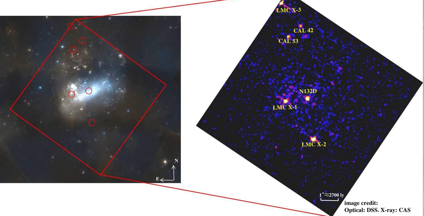 The preliminary X-ray “time-lapse photograph” (right) in 0.5–4 keV band as the result from a 700-second one-shot observation on the Large Magellanic Cloud (LMC), our neighbor galaxy, in comparison with the DSS optical image of LMC.
