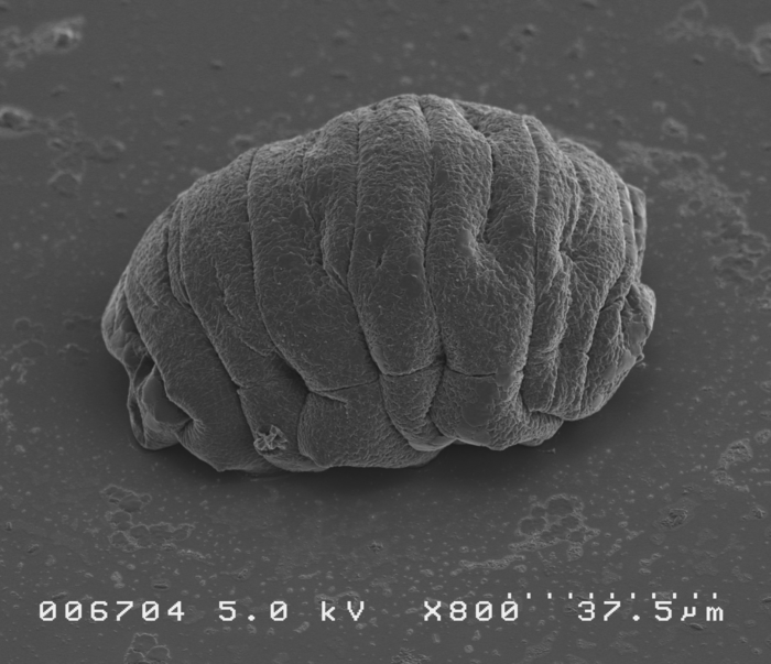 Scanning electron microscope image of the dehydrated tardigrade, Ramazzottius varieornatus.