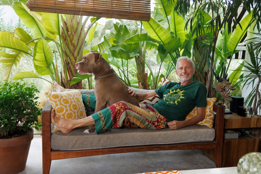 Patrick Cox with his dog Titus at his home in Ibiza. T-shirt, from the Multidisciplinary Association for Psychedelic Studies. Photograph: Karl Grant/The Guardian