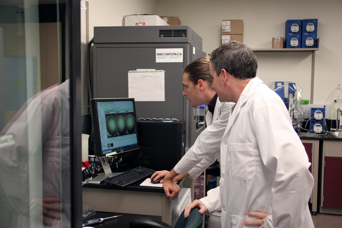 A photo of Nathan Bullen and Jon Whitney is attached. Cutline: Nathan Bullen (left) and John Whitney (right) examine crystals of the purified toxin, which they used to solve its 3-dimensional structure through X-ray crystallography. Credit: Blake Dillon, McMaster University.