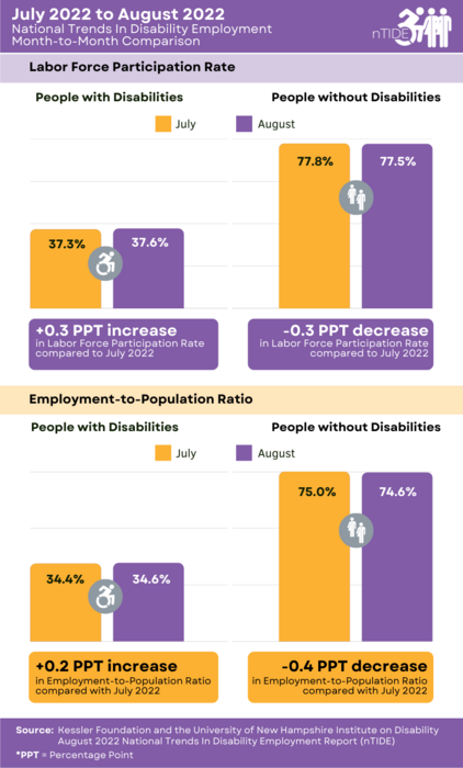 Findings were similar for August’s labor force participation rate. For people with disabilities (ages 16-64), the labor force participation rate increased slightly from 37.3 percent in July to 37.6 percent in August (up 0.8 percent or 0.3 percentage points). For people without disabilities (ages 16-64), the labor force participation rate decreased slightly from 77.8 percent in July to 77.5 percent in August (down 0.4 percent or 0.3 percentage points). The labor force participation rate is the percentage of the population that is working, not working, and on temporary layoff, or not working and actively looking for work.
