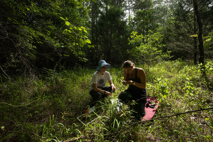 CAPTION: Skidmore College student Sar Lindner (left) observes as Rice University graduate student Ali Campbell examines a grass stem for signs of symbiotic fungi during a field sampling expedition near Huntsville, Texas. (Photo by Jeff Fitlow/Rice University)