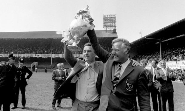Brian Clough (left) and his assistant Peter Taylor show off the League Championship trophy to jubilant Derby County fans in May 1972.