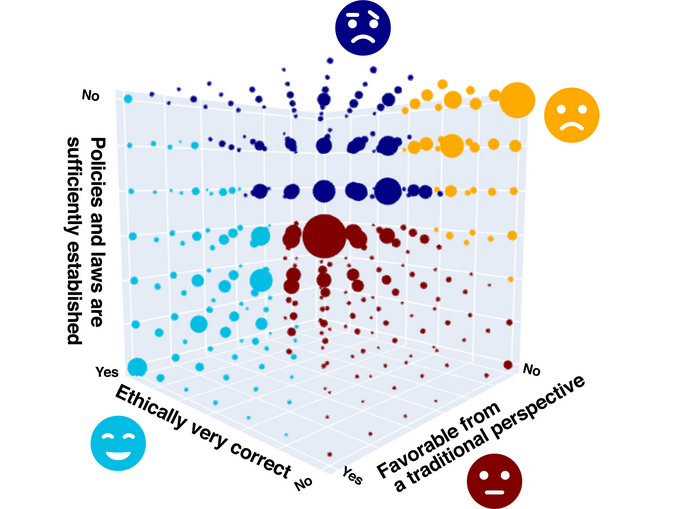 IMAGE: FIGURE 1: ANSWERS FROM RESPONDENTS IN JAPAN, US, AND GERMANY SEPARATED INTO ETHICAL, LEGAL AND TRADITIONAL ANSWERS. BY MEANS OF SEGMENTATION, THE RESPONSES CAN BE COLOR-CODED ACCORDING TO WHETHER THE RESPONDENT’S ANSWER WAS POSITIVE (LIGHT BLUE), NEGATIVE (ORANGE), CONCERNED ABOUT LEGAL ISSUES (NAVY) OR NOT CONCERNED ABOUT LEGAL ISSUES (CRIMSON). view more