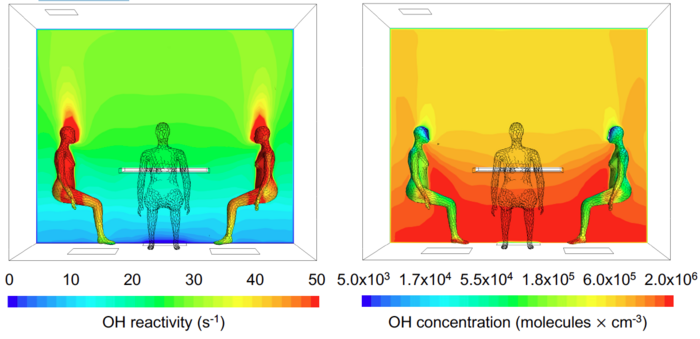 In order to understand how the human-generated OH field looked like in space and time during the experiments, results from a detailed multiphase chemical kinetic model from the University of California, Irvine were combined with a computational fluid dynamics model from Pennsylvania State University, both based in the USA. After validating the models against the experimental results, the modeling team examined how the human-generated OH field varied under different conditions of ventilation and ozone, beyond those tested in the laboratory. From the results, it was clear that the OH radicals were present, abundant, and forming strong spatial gradients.