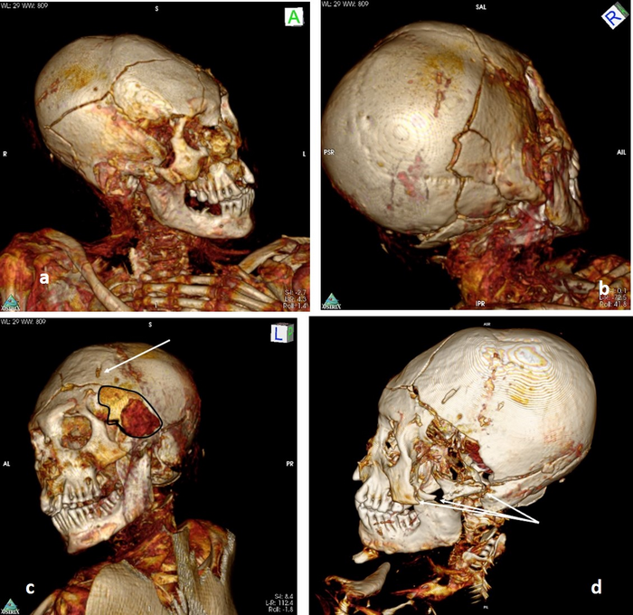 3D CT scan of the skull of the Délémont male mummy. (a-d): Features of perimortem skull trauma to the left side of the skull with a large perforating lesion at the left temporal region (arrow) and a fracture running into the skull. (d) shows the zygoma’s fracture of the left side (arrows).