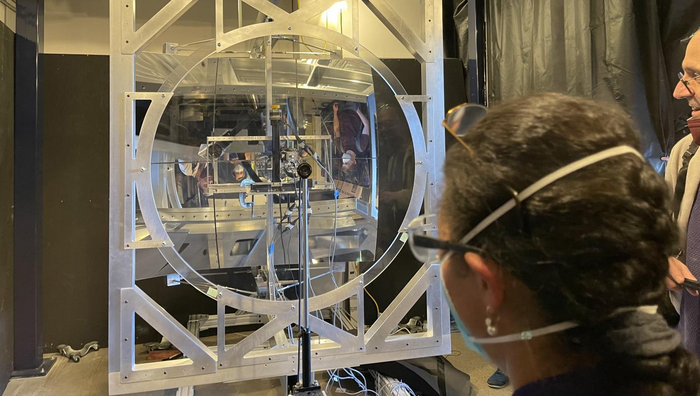 Grant and Award AnnouncementIMAGE: NASA ASTROPHYSICIST TONIA VENTERS AND JEM-EUSO SPOKESPERSON ETIENNE PARIZOT REVIEW THE PARTIALLY ASSEMBLED FLUORESCENCE TELESCOPE, PART OF A MISSION TO FLY 110,000 FEET ABOVE THE EARTH TO SEARCH FOR INCOMING PARTICLES, AT THE COLORADO SCHOOL OF MINES. view more