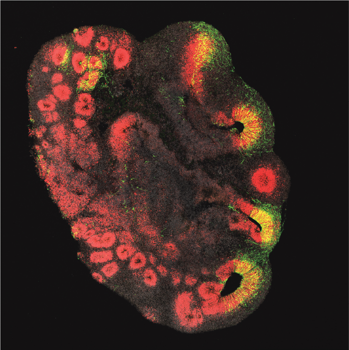 Peer-Reviewed PublicationIMAGE: A BRAIN ORGANOID ABOUT 3 MILLIMETERS IN SIZE MADE FROM STEM CELLS OF A CHIMPANZEE. THE BRAIN STEM CELLS ARE STAINED RED; BRAIN STEM CELLS THAT RECEIVED THE ARHGAP11B GENE ARE SHOWN IN GREEN. PHOTO: JAN FISCHER view more