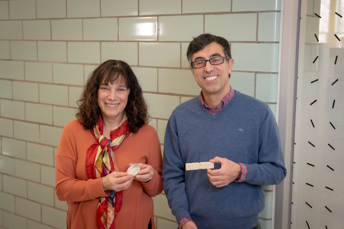 Peer-Reviewed PublicationIMAGE: WPI RESEARCHERS NIMA RAHBAR AND SUZANNE SCARLATA HOLD UP SAMPLES OF THEIR ENZYMATIC CONSTRUCTION MATERIAL view more