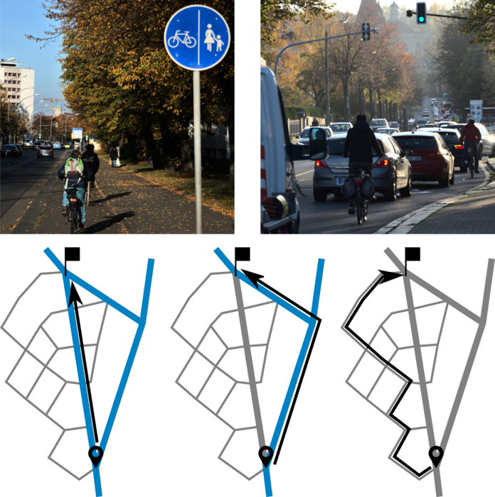 IMAGE: THE ROUTE CHOICE OF CYCLISTS IS SUBJECT TO VARIOUS DECISION FACTORS. FOR EXAMPLE, MANY PREFER A SEPARATE BIKE LANE (TOP LEFT) INSTEAD OF SHARING SPACE WITH DENSE CAR TRAFFIC (TOP RIGHT). DEPENDING ON WHETHER STREETS WITH HEAVY CAR TRAFFIC (THICK EDGES) ARE EQUIPPED WITH DEDICATED BIKE PATHS (BLUE) OR NOT (GRAY), CYCLISTS TAKE THE DIRECT ROUTE (BLACK ARROW, BOTTOM LEFT), TAKE DETOURS TO STAY ON BIKE PATHS (BOTTOM CENTER) OR RIDE ON SMALL SIDE STREETS (THIN EDGES) (BOTTOM RIGHT). view more