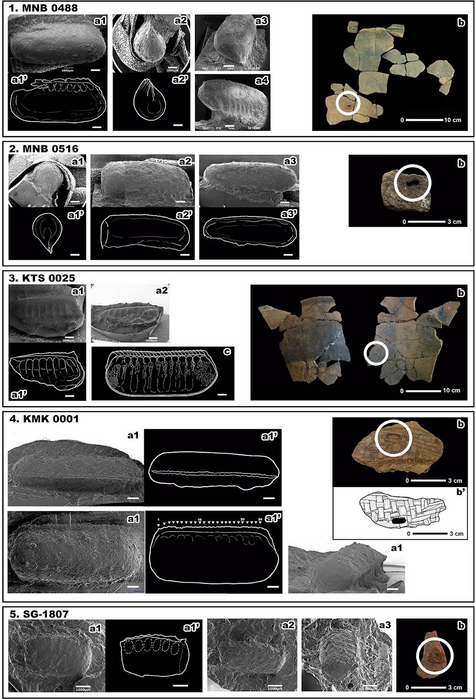 Scanning electron microscope (SEM) images and illustrations of cast cockroach egg case impressions from Japanese archaeological sites. a: SEM images, a’: illustrations of SEM images, b: locations of impressions, c: illustration of the inner part of the modern smokybrown cockroach (Periplanata fuliginosa) egg casing. ※White bars without numbers indicate 1 mm.