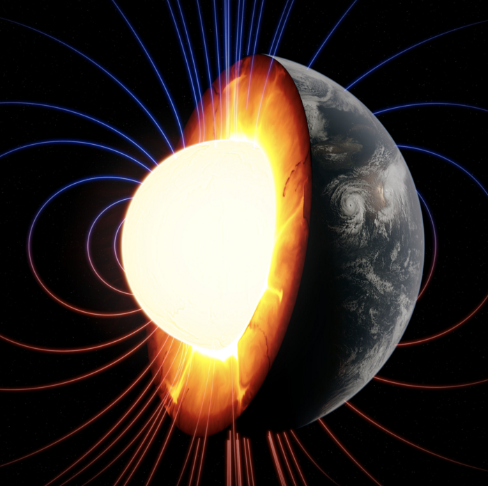 Peer-Reviewed PublicationIMAGE: AN INTERIOR CUTAWAY OF THE EARLY EARTH HIGHLIGHTING ITS MAJOR GEODYNAMIC PROCESSES. MAGNETIC FIELD LINES ARE DRAWN IN BLUE AND RED EMANATING FROM THE LIQUID CORE THAT GENERATED THEM, WHILE PLATE TECTONIC FORCES REARRANGE THE SURFACE AND PLAY A ROLE IN THE CHURNING CIRCULATION OF THE ROCKY MANTLE BELOW. view more