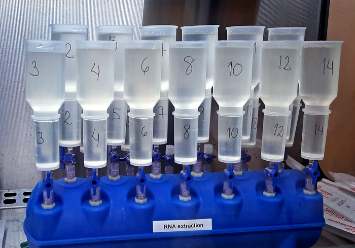IMAGE: VIALS CONTAINING SEWAGE WATER ARE SCANNED A METHOD FOR MONITORING COVID-19 IN SEWAGE, WHICH CAN ALSO BE USED TO TRACE THE SOURCE OF OTHER OUTBREAKS, INCLUDING MONKEYPOX AND HEPATITIS. view more