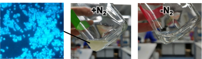 Peer-Reviewed PublicationIMAGE: CLOSE VIEW OF METHANOTHERMOCOCCUS THERMOLITHOTROPHICUS CULTURE UNDER THE MICROSCOPE (LEFT) AND IN A CULTURE FLASK (MIDDLE AND RIGHT). THESE CELLS GROW ON NITROGEN GAS AS THE ONLY SOURCE OF NITROGEN. IF THERE IS NO NITROGEN GAS PRESENT, NOTHING GROWS (RIGHT). view more