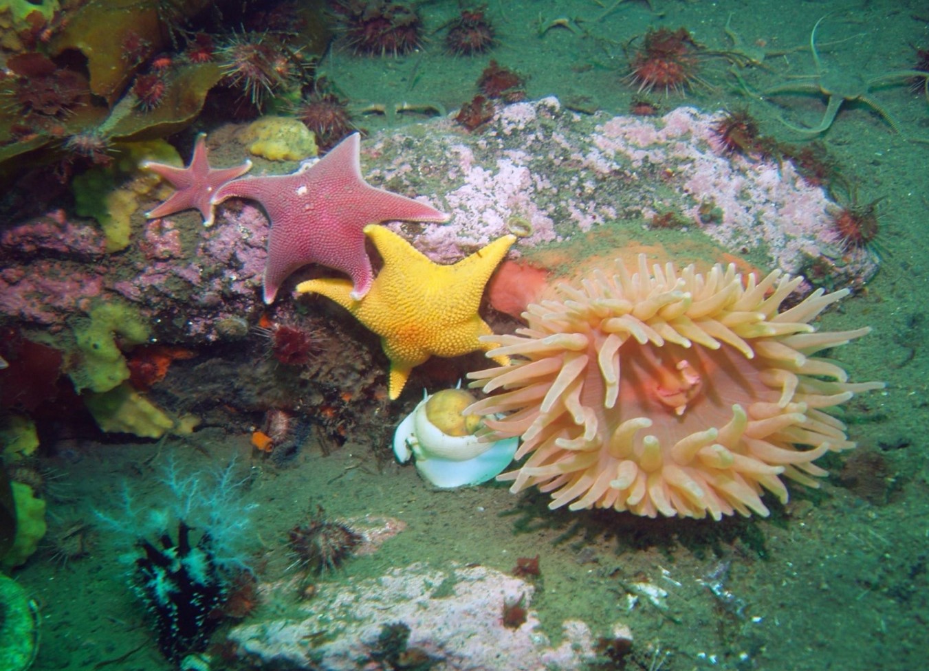 Sea stars, urchins, sponges, anemones are among the marine organisms in this benthic community in shallow areas in Deception Island, Antarctica.
