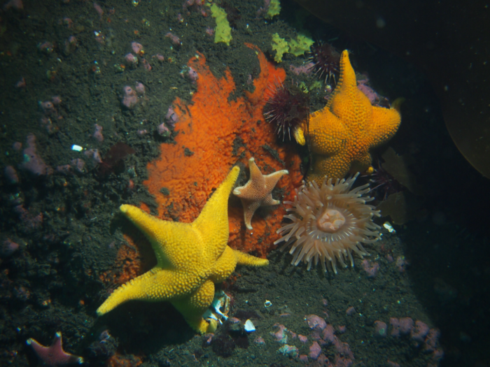 Sea stars, urchins, sponges, anemones are among the marine organisms in this benthic community in shallow areas in Deception Island, Antarctica.