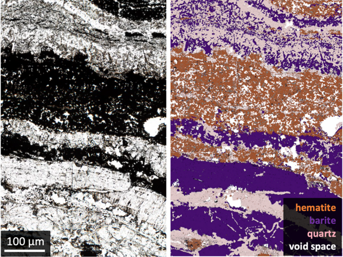 Optical photomicrograph (left) and EDX map (right) showing primary and replacement mineralogy in undulatory laminations of the Dresser Formation stromatolites.