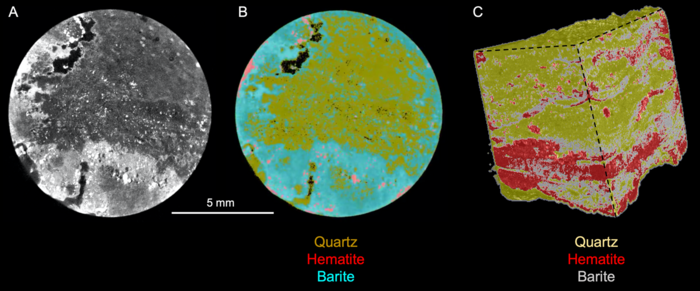 Three-dimensional rendering of stromatolite microstructure, enabling the distribution of phases throughout the structure of the stromatolites to be visualized.