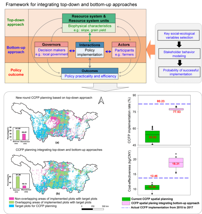 To improve top-down policies based ecological restoration, this team developed a new approach that incorporates bottom-up approaches targeting stakeholder interests while addressing social considerations for behavior analysis. Based on this integrated top-down and bottom-up approach, a meta-analysis was introduced to identify key socioeconomic and social-ecological factors influencing large-scale ecological restoration implementation, and a stochastic model was constructed to analyze the impact of socioeconomic drivers on the behaviors of decision-makers and participants at large scales.