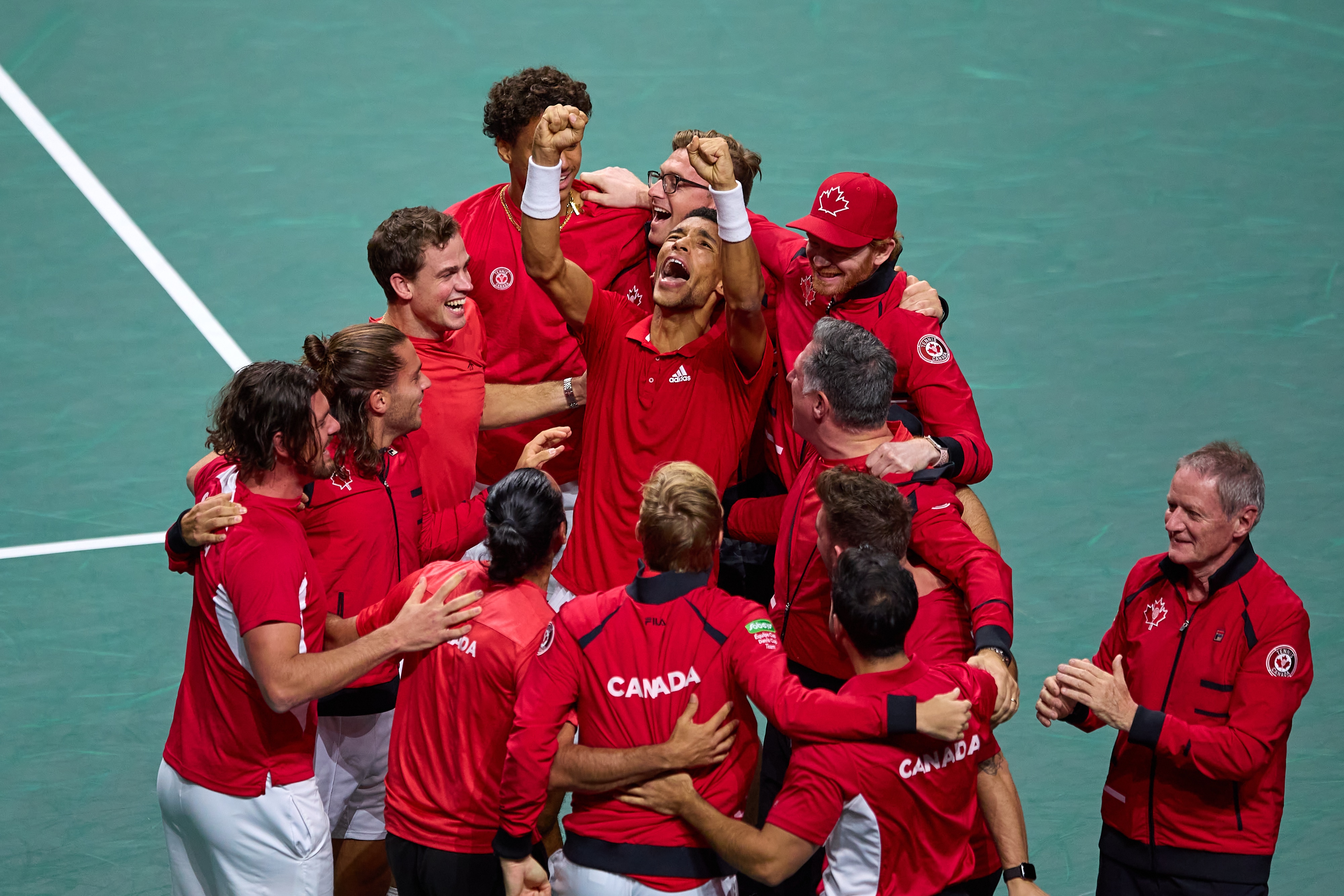 Felizx Auger-Aliassime is mobbed by his teammates as Canada celebrate their historic Davis Cup triumph. (Getty Images: Fran Santiago)