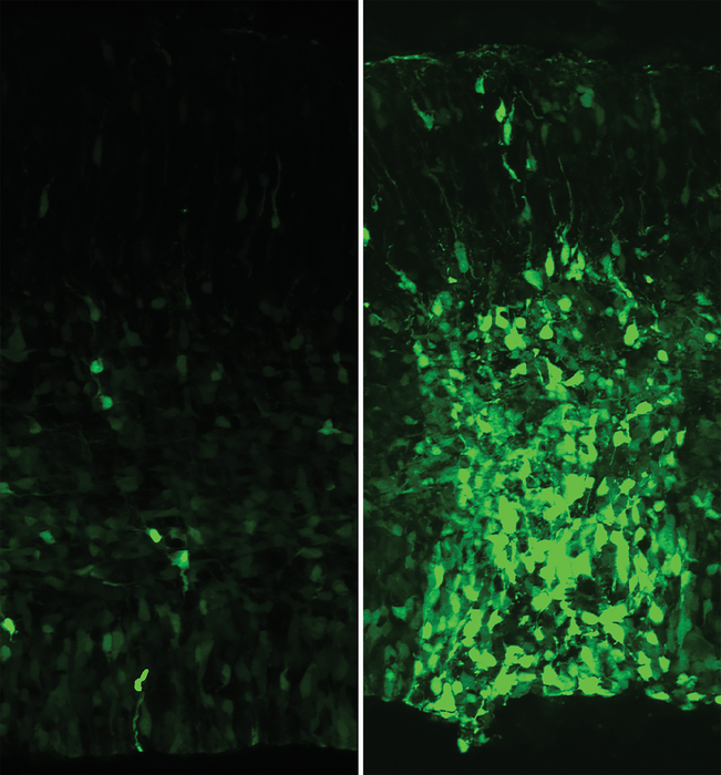 Peer-Reviewed PublicationIMAGE: THE FLUORESCENT GLOW OF MOUSE BRAIN CELLS ON THE RIGHT INDICATES THE EFFECTIVENESS OF A HUMAN-DERIVED GENE ENHANCER, HAQER0059, VERSUS A 6 MILLION YEAR OLD VERSION OF THE ENHANCER AT LEFT, WHICH CANNOT ACTIVATE GENES IN THE SAME WAY BECAUSE IT IS ABOUT 40 BASE PAIRS DIFFERENT FROM THE HUMAN VERSION. view more