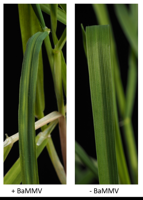 IMAGE: TYPICAL YELLOW MOSAICS ON THE LEAVES OF A BARLEY PLANT INFECTED WITH THE BAMMV VIRUS IN THE GREENHOUSE (LEFT) IN DIRECT COMPARISON WITH A HEALTHY PLANT (RIGHT). view more