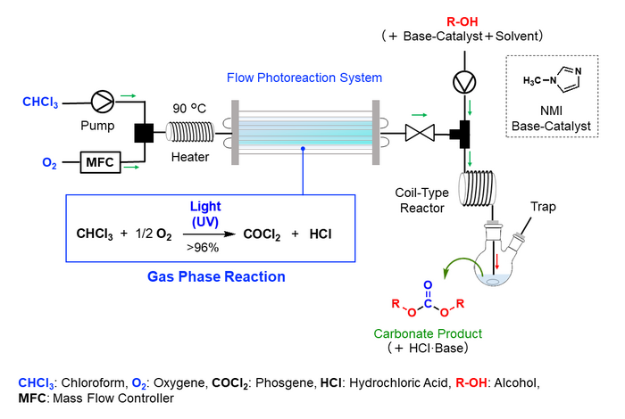 In this research, a flow photo-on-demand system was redesigned for the photo-oxidation reaction of chloroform. Through experimenting with various flow channel arrangements, materials and light sources, the following system was created as shown in Figures 1 and 3. In the batch photo-on-demand method developed by this research group previously, the photoreaction between the chloroform and oxygen occurs in heterogeneous phases where the chloroform is a liquid and the oxygen is a gas (Figure 2c). However, in experiments using the new system the authors found that the reaction dramatically increased when both were in a gaseous state. By irradiating this gaseous mixture of vaporized chloroform and oxygen under ultraviolet light, the majority (over 96%) was converted into phosgene. Furthermore, the phosgene continuously reacted with the alcohol inside the system (with a base catalyst added as required), which meant that the system could be used to continuously synthesize high yields of chloroformate, carbonates and polycarbonates on a gram scale (Figure 4). These reactions are completed inside the system so the highly toxic phosgene gas does not escape. N-methylimidazole (NMI), which becomes an ionic liquid when it reacts with hydrogen chloride, was used as the base catalyst, so carbonates could be synthesized without using additional solvents. This system can be scaled up further, which will enable it to be used in a wide range of fields from academia to chemical industries.