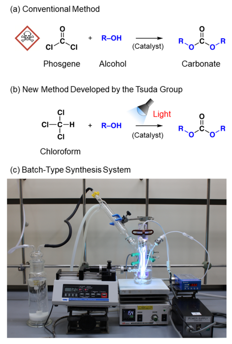 The research group has named their discovery ‘photo on demand organic synthesis method’ and have successfully used it to synthesize numerous useful organic chemicals and polymers (list of patents (in Japanese): Patents of Tsuda Laboratory). For example, they successfully synthesized large quantities of chloroformate and carbonate in a safe, inexpensive and simple manner merely by irradiating a mixed solution of chloroform and alcohol (with a base added as needed) with light (Figure 2, for more information see press release (Japanese) and journal paper (English)).