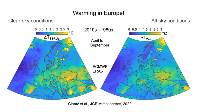 IMAGE: LEFT AND RIGHT FIGURES SHOW WARMING IN EUROPE OF THE SUMMER HALF YEAR DURING THE LATEST FOUR DECADES, SUBDIVIDED FOR CLEAR-SKY AND ALL.SKY CONDITIONS, RESPECTIVELY. view more