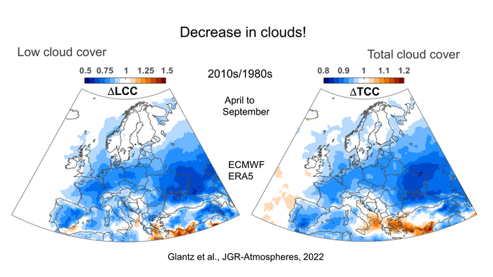 IMAGE: LEFT AND RIGHT FIGURES SHOW WARMING IN EUROPE OF THE SUMMER HALF YEAR DURING THE LATEST FOUR DECADES, SUBDIVIDED FOR CLEAR-SKY AND ALL.SKY CONDITIONS, RESPECTIVELY. view more