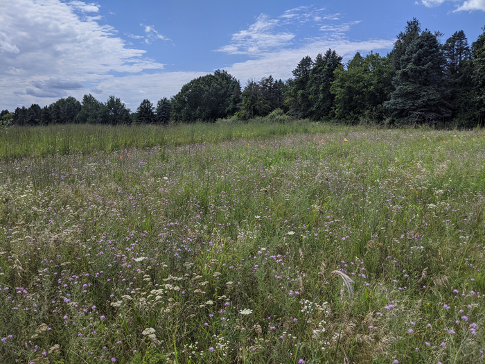 The boundary between two plots of prairie restored by MSU researchers, where the difference between them is the year they were planted. Native big bluestem grass in dominant in the plot to the left, while purple flowers belonging to non-native knapweed populate the plot on the right.