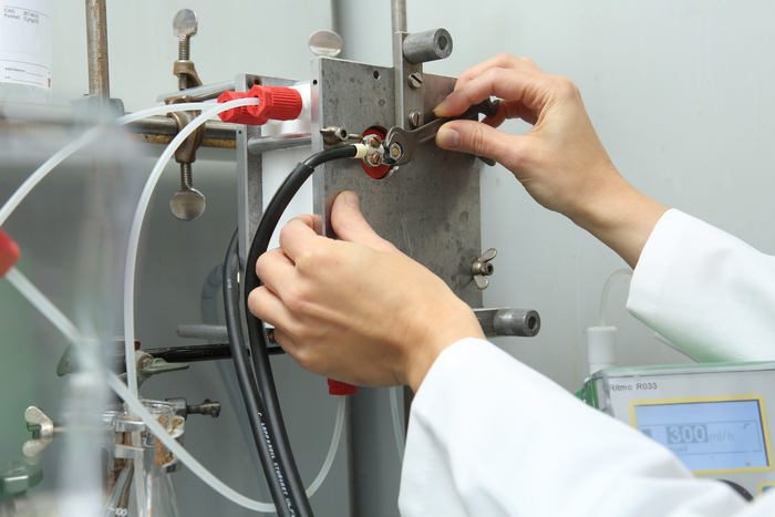 A researcher working on an electrochemical flow reactor
