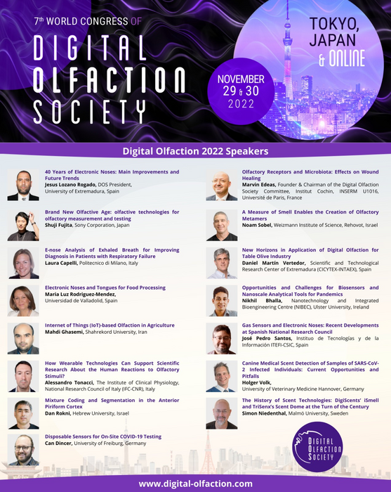 The 7th International Meeting of the Digital Olfaction Society (DOS) will take place on November 29-30 at Tokyo, Japan, and Online. This meeting is headed by Prof. Jesús Lozano Rogado, President of DOS, University of Extremadura, Spain.