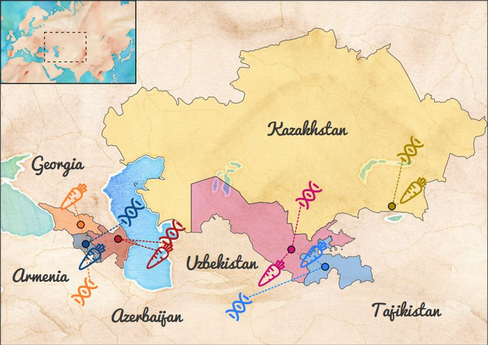 IMAGE: FIGURE 1. GEOGRAPHICAL MAP OF THE SIX POPULATIONS ALONG THE SILK ROAD INVESTIGATED IN THE STUDY. COLORED DOTS REFER TO REAL GEOGRAPHICAL LOCATIONS, CARROTS AND DNA ICONS REPRESENT INSTEAD THE “FOOD” AND “GENETIC” COORDINATES. CREDITS: SERENA ANELI view more