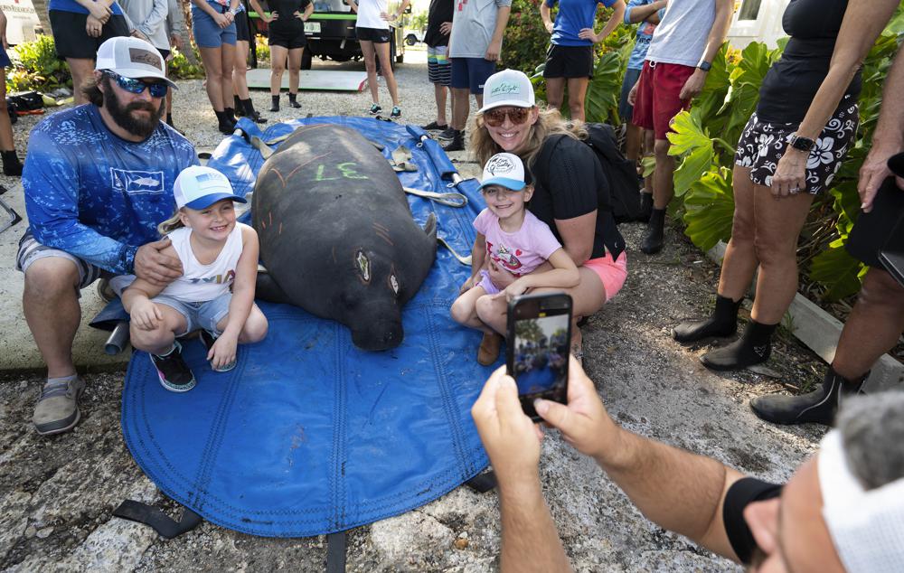 In this photo provided by the Florida Keys News Bureau, from left, Todd Weston, Rockie Weston, Zeiss Weston and Josie Norgren pose for a photo with an unnamed, rehabilitated adult male manatee before its release back to Florida Keys waters, Tuesday, Nov. 29, 2022, in Key Colony Beach, Fla. The family helped marine mammal rescuers recover the manatee off the Keys' Sombrero Beach in April 2022, suffering from propeller wounds to its head and a skull fracture caused by a boat strike. The manatee and two others, also rehabilitated, were released Tuesday in the Florida Keys.