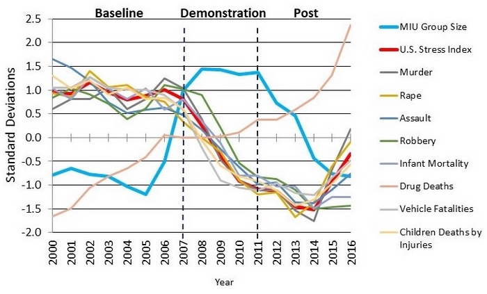 The results can be seen in the chart below. The blue line indicates that during the Baseline period of 2000 to 2006 the size of the TM and TM-Sidhi group located at Maharishi International University in Fairfield, Iowa increased to reach the √1% of the U.S. population (1725 people) and stayed there for five years during the Demonstration period from 2007 to 2011. All stress indicators immediately started decreasing. In the Post period when the size of the group size began to decline the rate of decrease in stress slowed and then it reversed and began to increase.