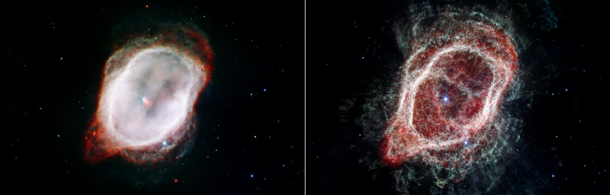 Each of these images is a composite view of the Southern Ring Nebula. They combine data from two instruments on the James Webb Space Telescope: The Mid-Infrared Instrument (MIRI) and the Near-Infrared Camera (NIRCam). The image on the left “highlights the very hot gas that surrounds the central stars,” according to the telescope’s team. The image on the right “traces the star’s scattered outflows that have reached farther into the cosmos.”