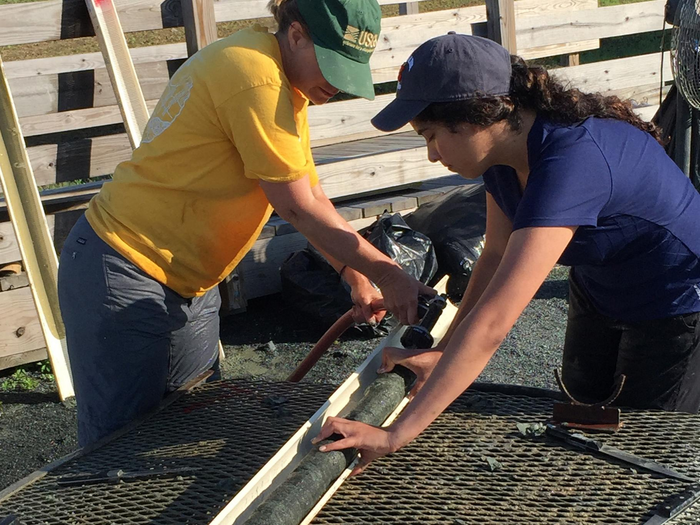 IMAGE: VICTORIA FORTIZ (RIGHT), THEN A GRADUATE STUDENT AT PENN STATE, AND JEAN SELF-TRAIL, A RESEARCH GEOLOGIST AT THE U.S. GEOLOGICAL SURVEY, WORK ON A CORE SAMPLE FROM THE HOWARDS TRACT SITE IN MARYLAND view more