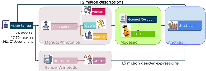 Peer-Reviewed PublicationIMAGE: THE RESEARCHES STARTED WITH THE ANNOTATION PROCESS, WHERE THEY COLLECTED MANUAL ANNOTATIONS FOR 9,613 DESCRIPTIONS AND OVER 1.5 MILLION GENDER EXPRESSION LABELS FOR CHARACTERS. THEN THEY DEVELOPED A MACHINE LEARNING MODEL TO IDENTIFY ACTIONS, AGENTS AND PATIENTS FROM THE NATURAL LANGUAGE FOUND IN THE MOVIE SCRIPTS. IN THE FINAL STEP, THEY UNDERTOOK STATISTICAL ANALYSIS TO UNCOVER PORTRAYAL DIFFERENCES ALONG CHARACTERS’ PORTRAYED ATTRIBUTES. view more