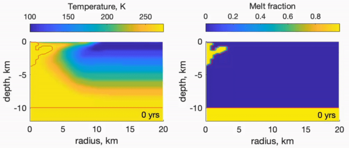 The study found that if an impact reaches the ice shell’s midpoint, over 40% of the meltwater will make it to the ocean. The volume of melt water generated can be significant. For example, this study showed that a half-mile-wide comet that reaches the ice shell’s midpoint would melt enough water to fill Oregon’s Crater Lake.