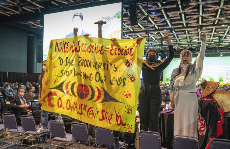 Protesters urge governments to stop invading Indigenous land in the process of biodiversity conservation during the opening ceremony of the COP15 UN conference on biodiversity in Montréal. THE CANADIAN PRESS/Paul Chiasson