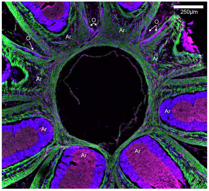 IMAGE: A HORIZONTAL A SLICE AT THE BASE OF THE ARMS (LABELED AS A) SHOWING THE ORAL INCS (LABELED AS O) CONVERGING AND CROSSING. view more