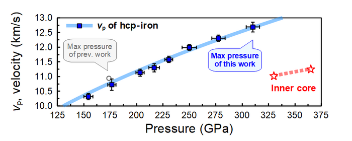 The researchers showed that the sound velocity of the inner core determined from seismological studies is 4±2% slower in compressional velocity and 36±17% slower in shear velocity than that of metallic iron.