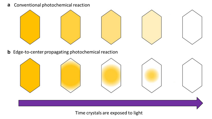 Normally, when light shines evenly on a crystal, the color change caused by the photoreaction also proceeds evenly. However, the research group found that in DSP crystals, the color change started at the crystal’s edge and proceeded to its center, propagating the photoreaction like a wave. The research group determined that this edge-to-center propagation of the color change happens for two reasons: a surface effect, which makes reactivity extremely high at the edges of the crystal, and a cooperative effect, which also elevates reactivity for molecules whose neighbors have already changed color.