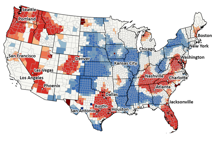 Peer-Reviewed PublicationIMAGE: WHERE DID AMERICANS MOVE OVER THE LAST DECADE? RESEARCH SHOWS THAT THE TOP MIGRATION DESTINATIONS (SHOWN IN RED) ALL FACE SIGNIFICANT CLIMATE RISKS, INCLUDING CITIES AND SUBURBS IN THE PACIFIC NORTHWEST, PARTS OF THE SOUTHWEST (IN ARIZONA, COLORADO, NEVADA, UTAH), TEXAS, FLORIDA, AND A LARGE SWATH OF THE SOUTHEAST (FROM NASHVILLE TO ATLANTA TO WASHINGTON, D.C.). IN CONTRAST, PEOPLE TENDED TO MOVE AWAY FROM PLACES (SHOWN IN BLUE) IN THE MIDWEST, THE GREAT PLAINS, AND ALONG THE MISSISSIPPI RIVER, INCLUDING MANY COUNTIES HIT HARDEST BY HURRICANES OR FREQUENT HEATWAVES, THE STUDY SHOWS. view more