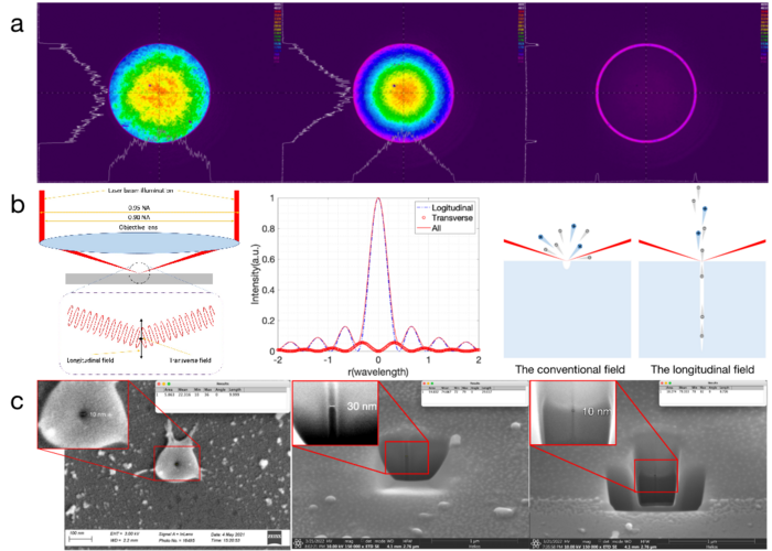 IMAGE: A, THE COLLIMATED GAUSSIAN SHAPED INTO HIGH QUALITY THIN ANNULAR BEAM. B, THE PRINCIPLE OF THE LONGITUDINAL FIELD GENERATION AND THE COMPARISON OF THE CONVENTIONAL FIELD AND THE LONGITUDINAL FIELD FOR MATERIALS ABLATION. C, 10 NM FEATURE GENERATED ON SAPPHIRE AND THE CROSS SECTION OF THE CROSS SECTION OF A HOLE WITH NO TAPER AND DEPTH TO WIDTH ASPECT RATIO OVER 16. view more