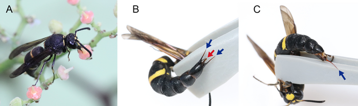 IMAGE: (A) AN ADULT MALE VISITING A CAYRATIA JAPONICA FLOWER. (B) THE PSEUDO-STINGS (PARAMERAL SPINES; BLUE ARROWS) AND AEDEAGUS (RED ARROW) OF AN ADULT MALE. (C) THE STING (BLUE ARROW) OF AN ADULT FEMALE. view more