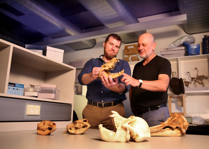 Peer-Reviewed PublicationIMAGE: PROFESSOR KRIS HELGEN (LEFT) AND PROFESSOR TIM FLANNERY WITH EXAMPLES OF MODERN MAMMAL SKULLS ON DISPLAY AT THE AUSTRALIAN MUSEUM FOLLOWING THE PUBLICATION OF A RECENT SCIENTIFIC PAPER AND THE LOCAL DISCOVERY OF AN EARLY MAMMALIAN JAW BONE PROMPTING THE SCIENTIST'S TO POSIT A THEORY OF MAMMALS MIGRATING OUT FROM THE SOUTHERN HEMISPHERE. SYDNEY, DECEMBER 13, 2022. view more