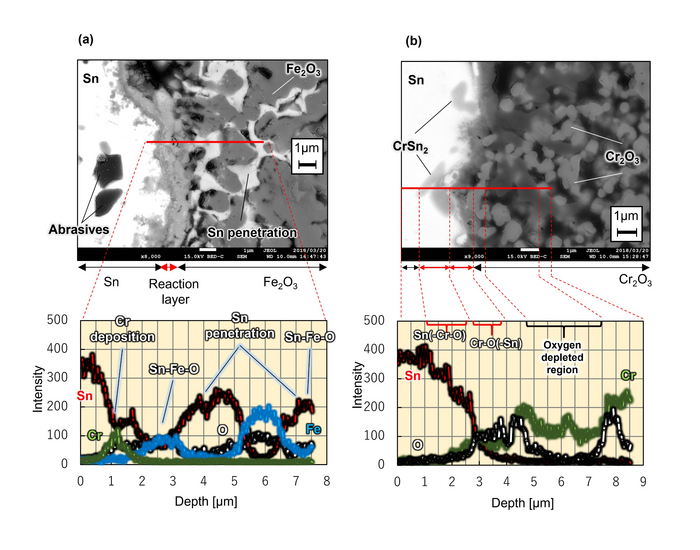 The researchers found that steel/iron-based structural materials corrode outwardly and inwardly while forming intermetallic compounds when exposed to high-temperature liquid metal tin. This is because iron, the main component of steel, reacts with high-temperature liquid tin. Therefore, the researchers theorized that it would be possible to prevent reaction with high-temperature tin by combining the iron with oxygen in advance to form an oxide prior to the reaction. Pursuing this theory, the researchers tested iron oxide (Fe2O3) and chromium oxide (Cr2O3) for compatibility with liquid tin at 500°C. The results are shown in Figure 3. When immersing the iron oxide sintered material, tin partially penetrated into the pores that were created during firing. However, the thickness of the reaction structure with tin on the material surface was about 1 micrometer. This was an extremely thin reaction which is only about 1% that of reduced activation ferritic steel. Moreover, when examining the sintered material of chromium oxide, it can be seen that the reaction structure with tin on the surface is very thin. In this way, the researchers found that even a metal element such as iron, which easily reacts with tin, can be significantly suppressed by prior reaction with oxygen to form an oxide.