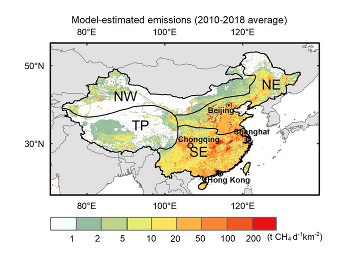 Figure 1 shows the model-estimated CH4 fluxes in four regions of China. The four regions, North China (NE), South China (SE), North-west China (NW), and the Qinghai-Tibetan Plateau (TP), vary with respect climate, geographical features, types of agriculture, major economic activities, and CH4 emission sources. The model-estimated average CH4 emissions from the four subregions over the period 2010–2018 are 30.0±1.0 (average ± standard deviation) Tg CH4 yr-1 from the SE region, 23.3±2.7 Tg CH4 yr-1 from the NE region, 2.9±0.2 Tg CH4 yr-1 from the NW region, and 1.7±0.1 Tg CH4 yr-1 from the TP region. The trends in CH4 emissions have varied in the different regions of China over the last nine years, with significant increase trends detected in the NE region and the whole China.